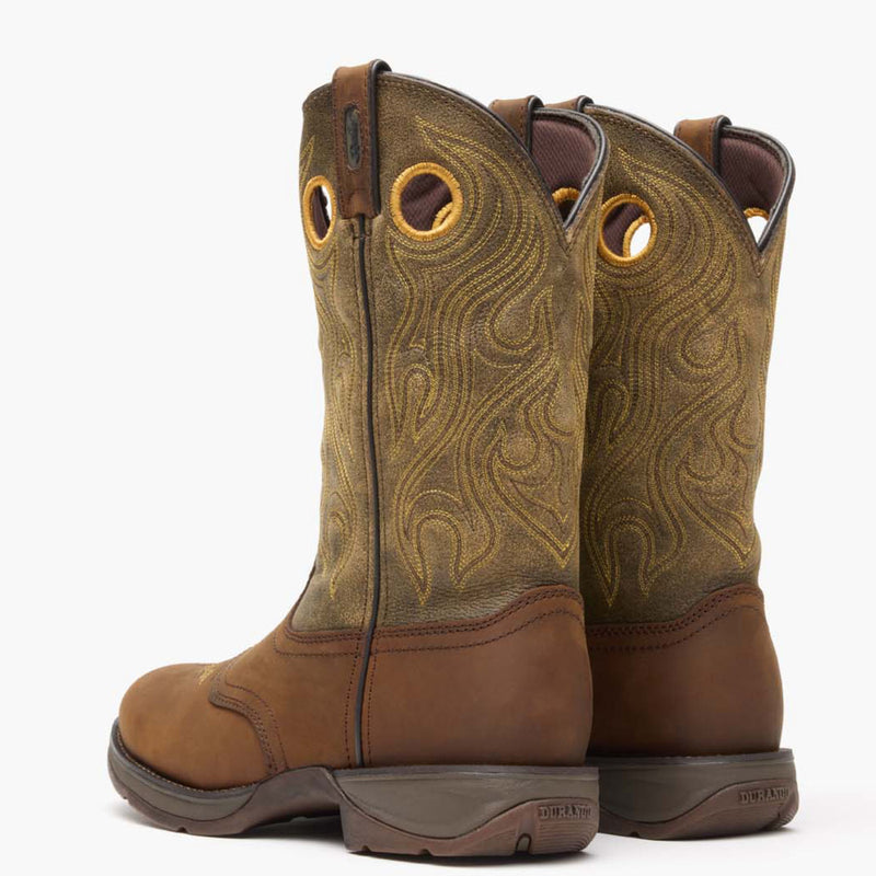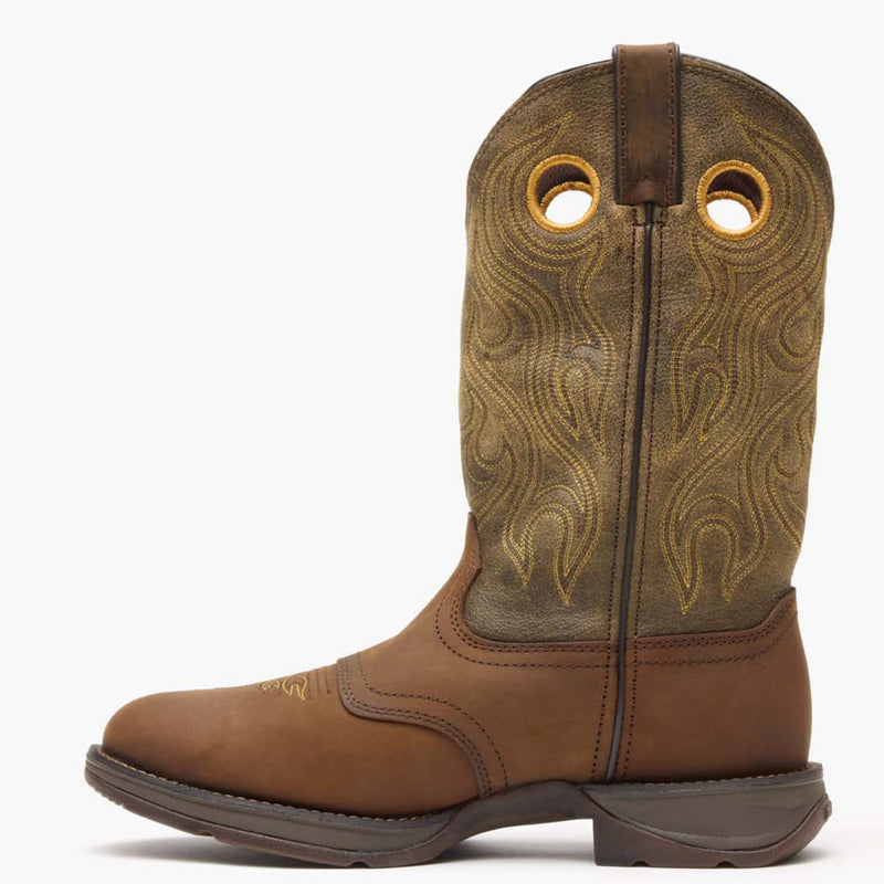 Las botas Rebel™ de Durango® para hombre están confeccionadas en cuero de grano completo resistente y diseñadas pensando en el estilo y el rendimiento. Estas botas marrones presentan llamativos detalles en amarillo, desde el bordado en forma de llama en la caña hasta las costuras y los tiradores. Las presillas y los tiradores en la parte superior facilitan su colocación, ya sea para ir al rancho o al rodeo.